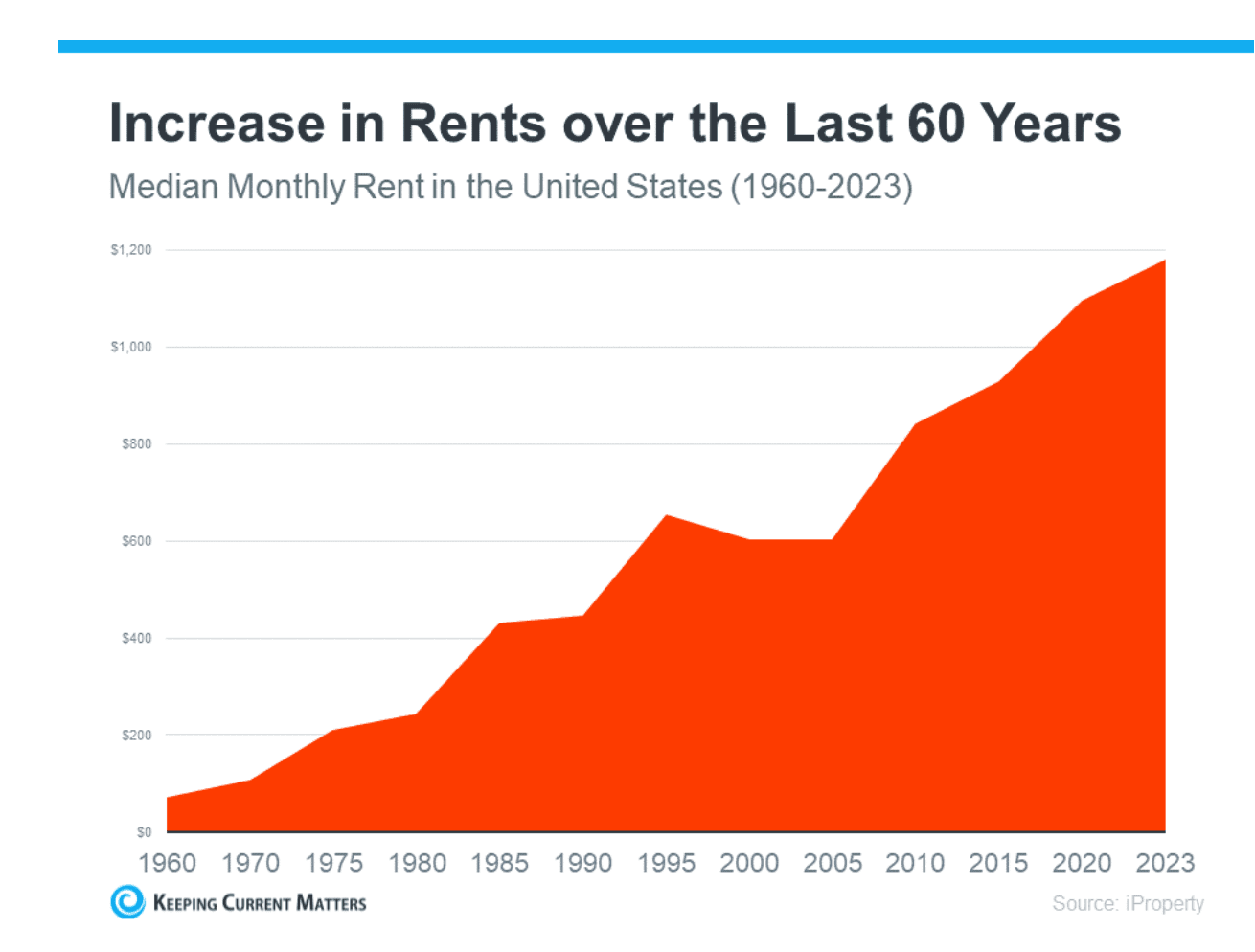 Another reason to think about buying a home instead of renting is the constant rent hikes. If you've ever felt the pinch of your rent going up year after year, you're not alone. That's because rents have been rising steadily over the past six decades (see the chart below).